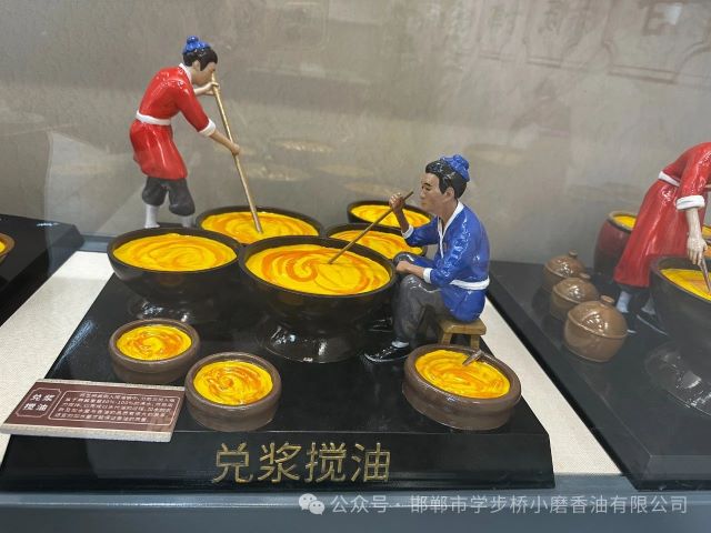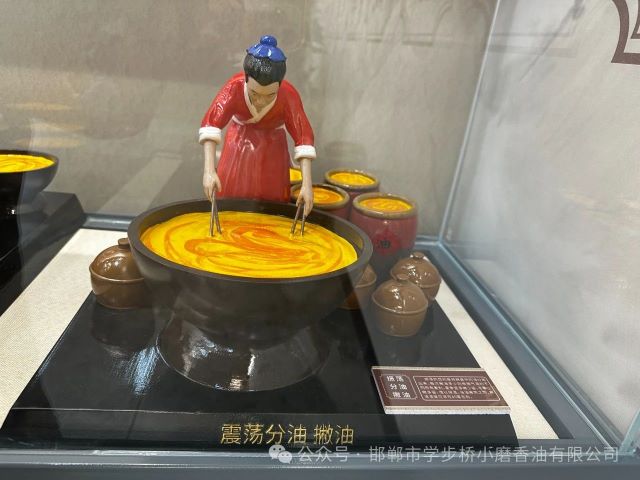 第六步,兌漿攪油。這是大名小磨工藝的核心。將油漿倒入攪油鍋中,緩緩分多次加入適量的沸水,通過不斷攪拌,讓油脂與其他物質分離。這一過程需要師傅們憑借豐富的經(jīng)驗,精準把握水的添加量和攪拌的力度與時間。在水與油漿的奇妙交融中,油脂逐漸浮出水面,仿佛是被大自然施展了魔法。