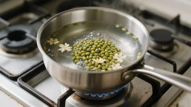 2.鍋中加入適量清水,放入綠豆,大火煮開(kāi)后轉(zhuǎn)小火煮至綠豆開(kāi)花、軟爛。