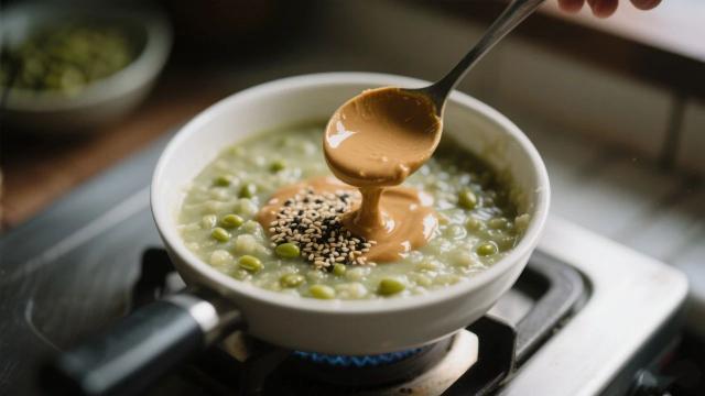5.關(guān)火后,待綠豆沙稍微降溫,加入芝麻醬,攪拌均勻即可。