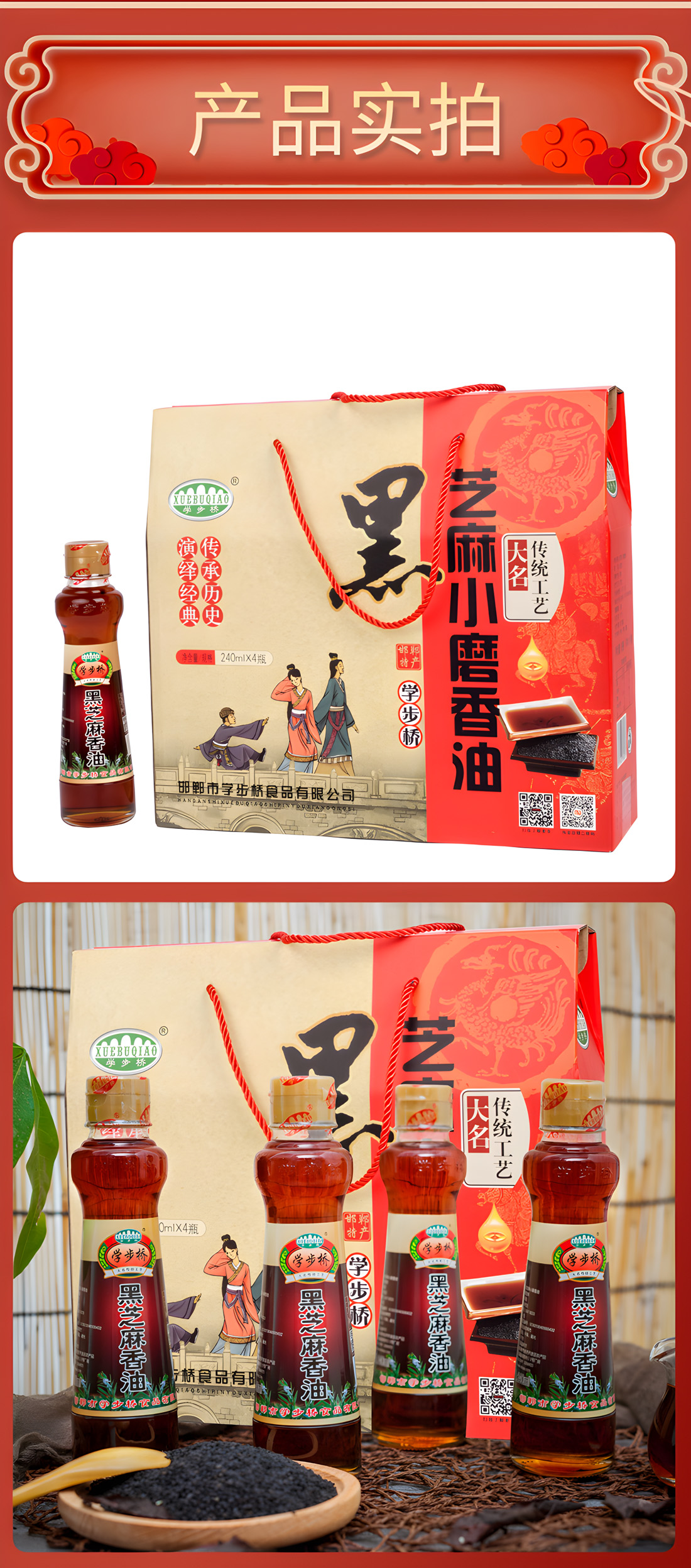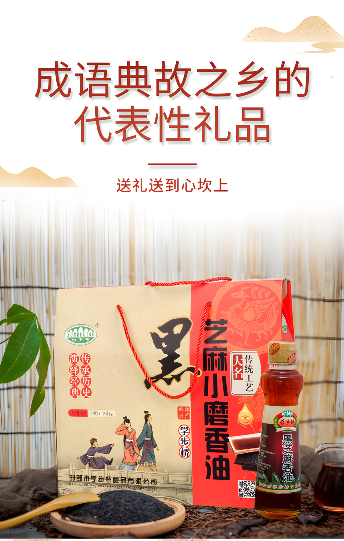 內(nèi)含240ml黑芝麻香油4瓶,黑芝麻香油營養(yǎng)價(jià)值高,做伴手禮更顯珍貴,瓶小而精致,存放更方便,且禮盒大小適中,此禮盒造型獨(dú)特,簡潔大氣,走親訪友,更顯卓爾不凡。