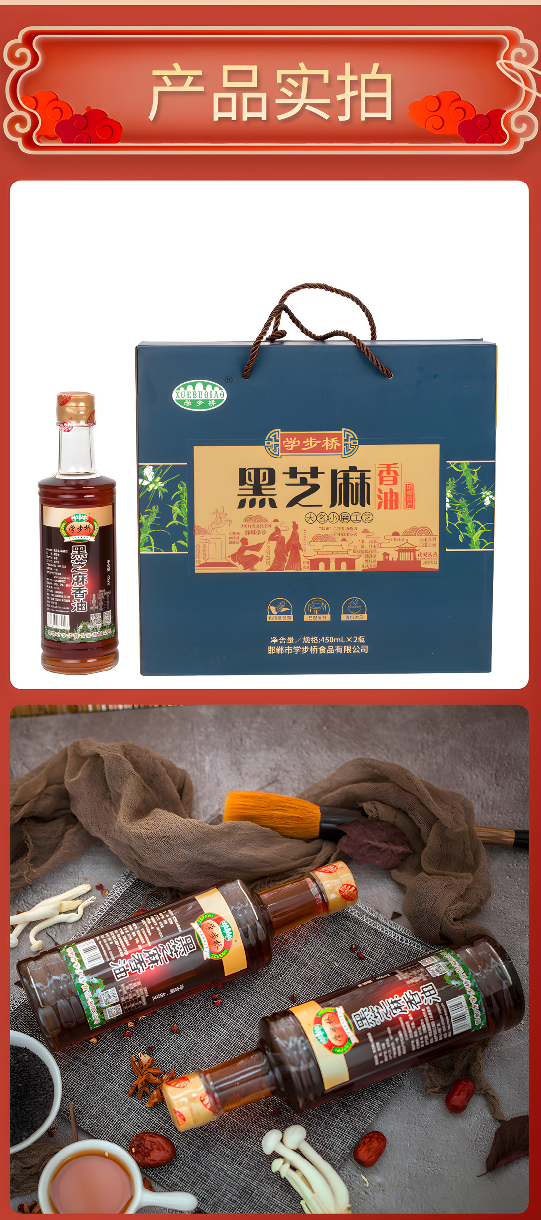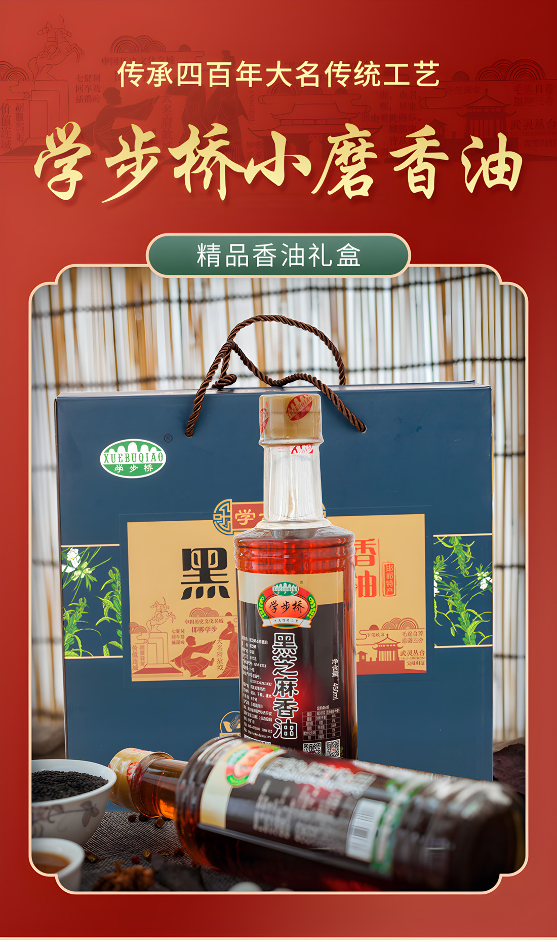 內(nèi)含450ml黑芝麻香油2瓶,黑芝麻香油營養(yǎng)價(jià)值高,做伴手禮更具特色,此禮盒外觀采用藍(lán)黃相間色彩搭配,簡潔大氣,插畫中的成語典故,讓您的親朋好友真正體驗(yàn)“品成語之鄉(xiāng)小磨香油,賞古城邯鄲歷史文化”的意境。