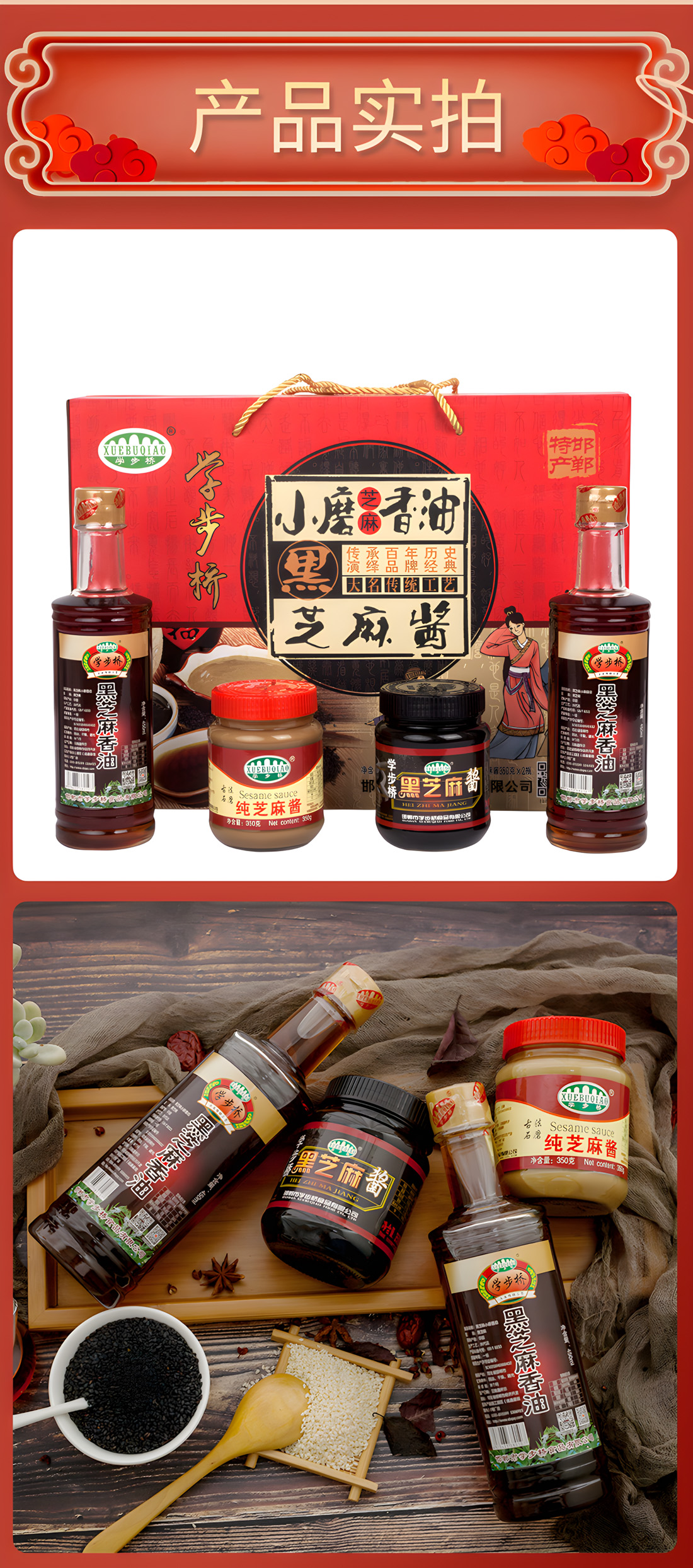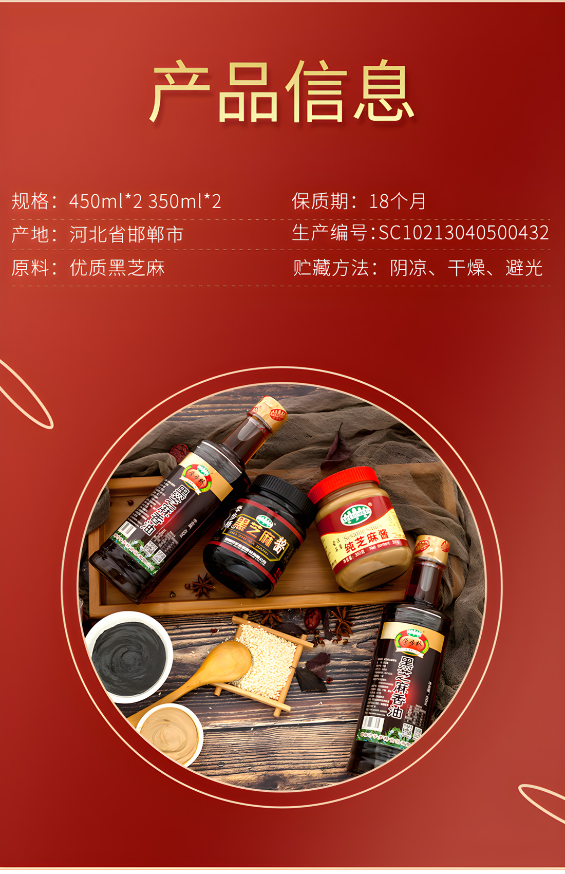 內(nèi)含360克黑白芝麻醬各一瓶,450ml黑芝麻香油2瓶,此禮盒為香油芝麻醬組合套裝,內(nèi)容豐富。禮盒尺寸較大,外觀更大氣,是拜訪領(lǐng)導(dǎo)、老師、長輩彰顯尊貴的伴手禮。