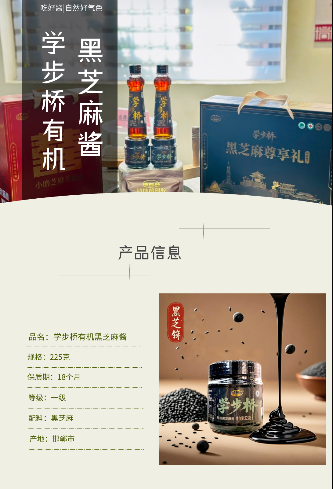 學(xué)步橋有機黑芝麻醬,以純粹的有機內(nèi)核,在香氣與營養(yǎng)間找到了完美平衡。有機種植,顆顆純凈用來磨醬的黑芝麻,來自堅持有機耕作的田間。不撒化肥,只施草木灰與有機肥;不噴農(nóng)藥,靠人工除草和生物防治守護作物。飽滿的芝麻粒在陽光下積累油脂與養(yǎng)分,采收后經(jīng)嚴格篩選,只留顆粒均勻、色澤烏亮的果實,從源頭保證每一口的純凈。沿用傳統(tǒng)石磨工藝,低溫慢研鎖住芝麻的本真香氣,開蓋瞬間,濃郁的芝麻香直竄鼻尖,帶著烘烤后的焦香與堅果的醇厚,可用于涂抹面包、拌涼菜、制作甜品等。