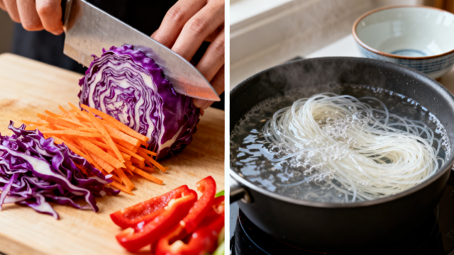 2. 紫甘藍、胡蘿卜、紅椒切細絲,黃瓜切段,生菜撕成適口大小