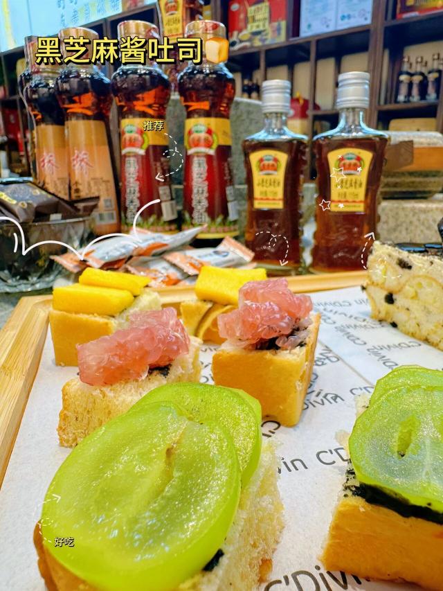 ·將吐司切成小塊,拿著吃超方便,脆吐司裹著黑芝麻醬和爆汁水果,太滿足啦~