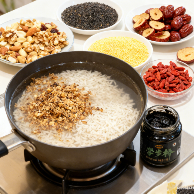 ?核心食材:學(xué)步橋黑芝麻醬2-3勺(約30g,粥的“靈魂”)、混合堅(jiān)果 50g(核桃、花生、杏仁等,提前碾碎)