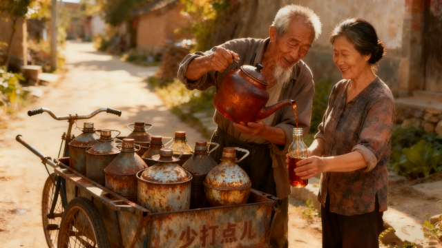 那時(shí)候的香油沒有花哨的品牌,它的“廣告”是走街串巷的油梆子聲?!鞍稹稹?,清脆的敲擊聲穿透清晨的薄霧,掠過巷口的老槐樹,像一句無(wú)聲的召喚,總能讓巷子里的主婦們紛紛探出頭來(lái)。賣香油的老漢推著一輛舊手推車,車上有個(gè)鐵質(zhì)的黑乎乎的香油桶,當(dāng)香油桶的蓋子打開時(shí),一股濃郁的芝麻香便爭(zhēng)先恐后地涌出來(lái),瞬間彌漫整條街巷。孩子們會(huì)圍著香油車打轉(zhuǎn),眼神里滿是好奇與渴望,那香氣像有魔力,勾得人直咽口水。
