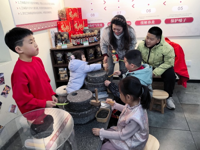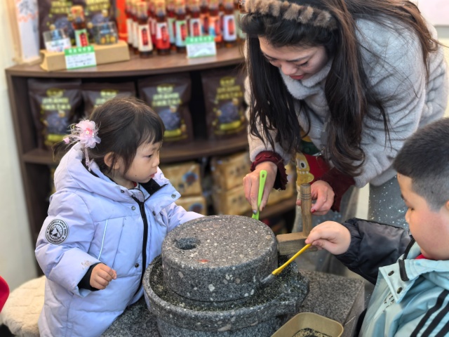 在親子互動體驗區(qū),現(xiàn)場氣氛尤為熱烈。許多小朋友在家長的陪伴下,親手轉動小石磨,體驗磨制芝麻的樂趣。在一推一轉之間,孩子們近距離接觸傳統(tǒng)技藝,感受老手藝的獨特魅力,讓非遺文化在實踐中得到傳承與傳播。不少家長表示,這樣的體驗不僅有趣,更有意義,讓孩子在游玩中了解家鄉(xiāng)文化,感受傳統(tǒng)工藝之美。