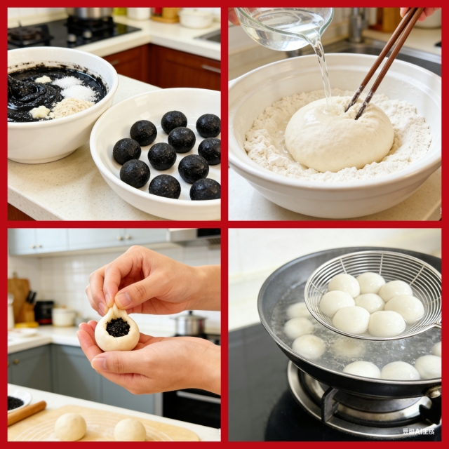 3. 包湯圓:取一小塊醒好的面團(tuán),搓成小圓球,用大拇指在中間按出一個小窩,放入一顆定型好的黑芝麻餡。用虎口慢慢向上推擠,封口后輕輕搓圓,一顆圓潤飽滿的湯圓就做好了。全程可在手心沾少許熟糯米粉,防止粘手。
